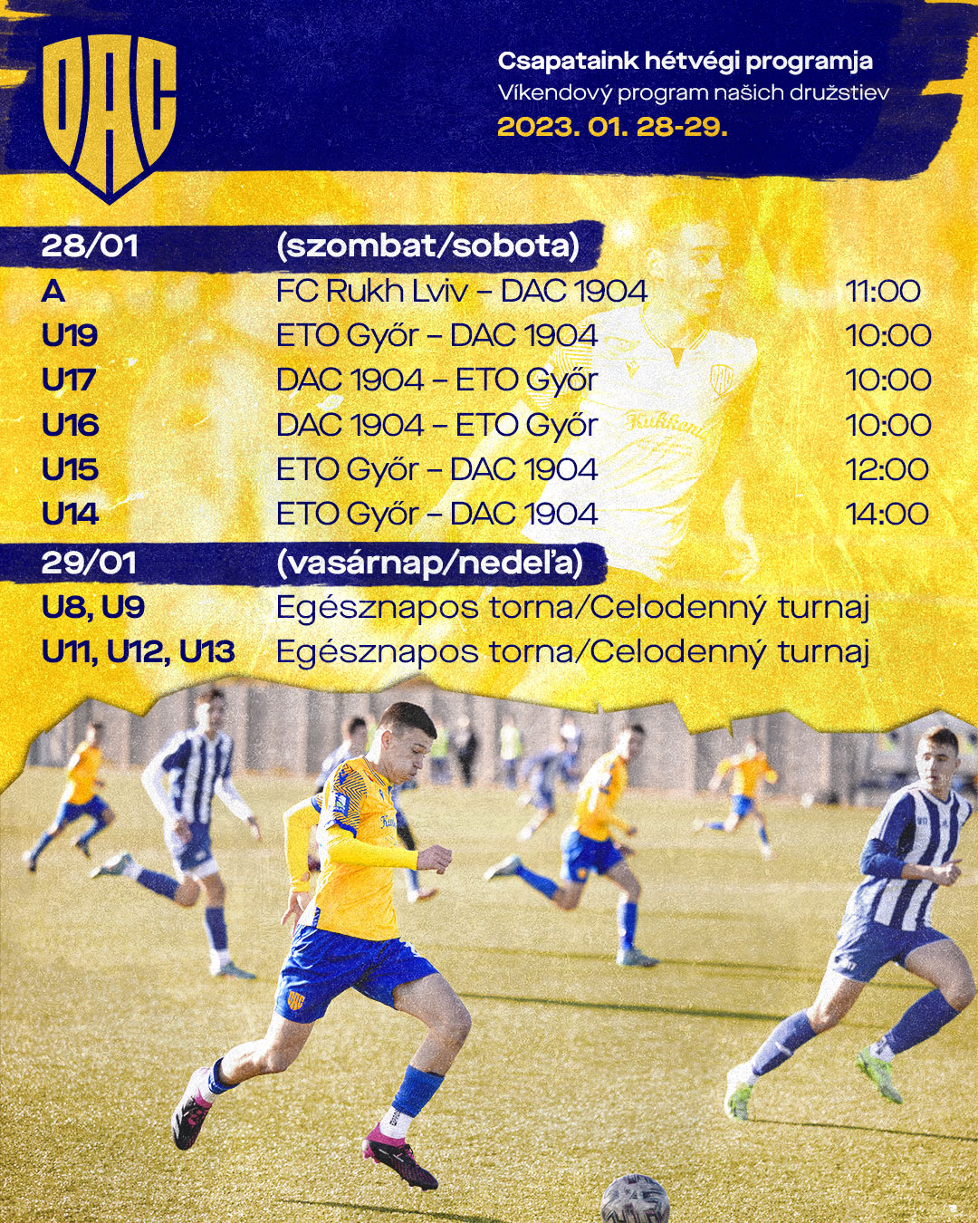 Pozrite si kompletný víkendový program našich tímov - srdečne vás pozývame na prípravné zápasy do našej akadémie! V sobotu privítame mužstvá FC ETO Győr, a v nedeľu najmladšie tímy budú absolvovať celodenné turnaje.