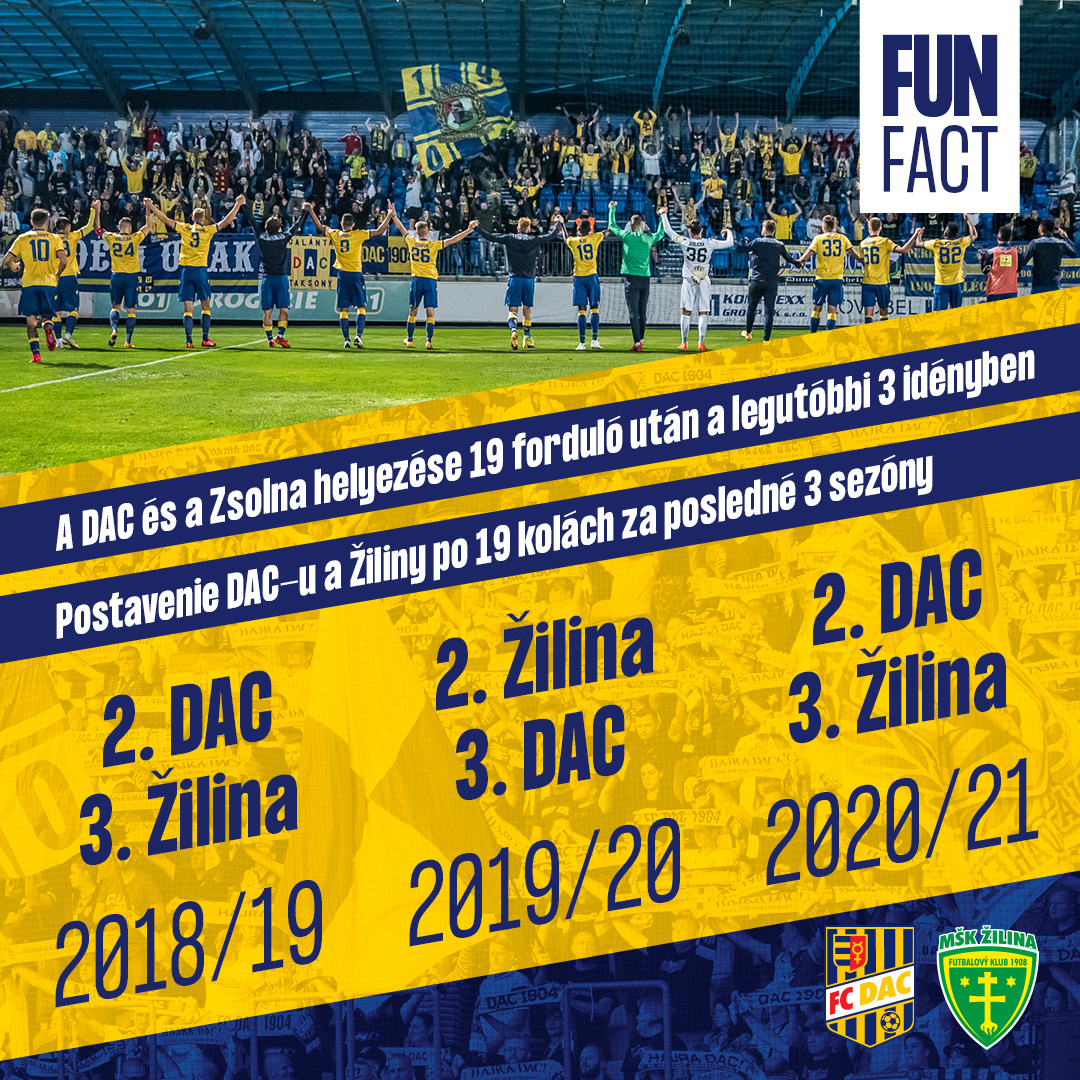 A két együttes az elmúlt években a bajnokság legjobbjai közé tartozik, amit az a tény is alátámaszt, hogy a 2018/19-es szezon óta a 19. forduló után mindig a DAC és a Zsolna állt a tabella 2. és 3. helyén. Ebből két alkalommal mi, tavaly pedig holnapi ellenfelünk állt az ezüstérmes pozíciójában.