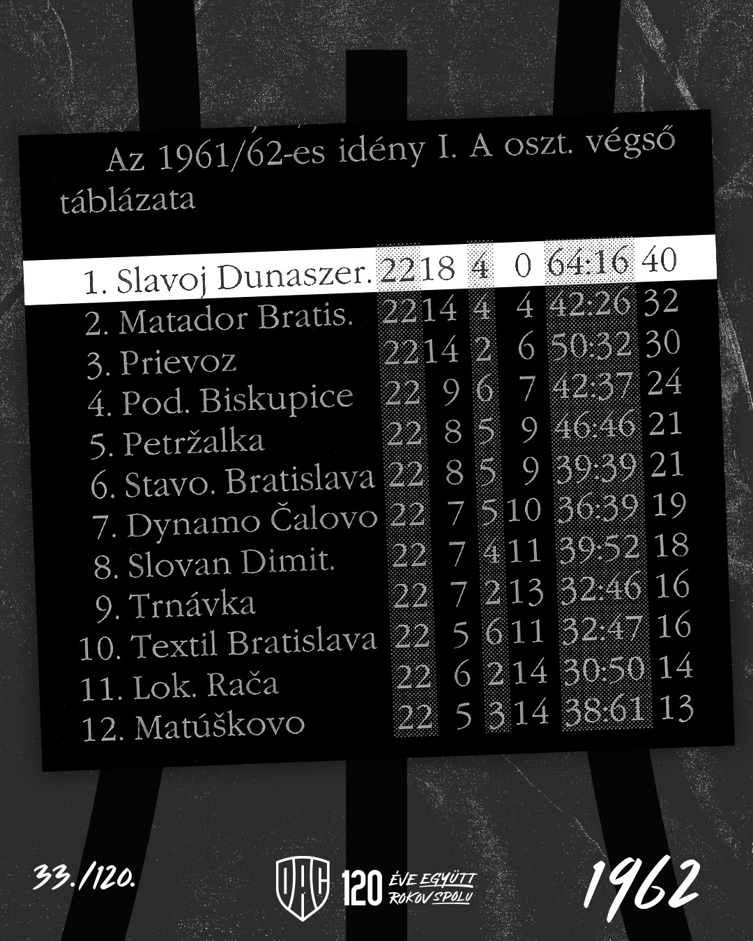 1962: Az 1961/62-es idény I. A osztályának végső táblázata. A Slavoj veretlenül nyerte a kerületi bajnokságot, új fejezetet nyitva városunk labdarúgásának történelmében: Dunaszerdahely csapata első alkalommal került az országos harmadik vonalba.
