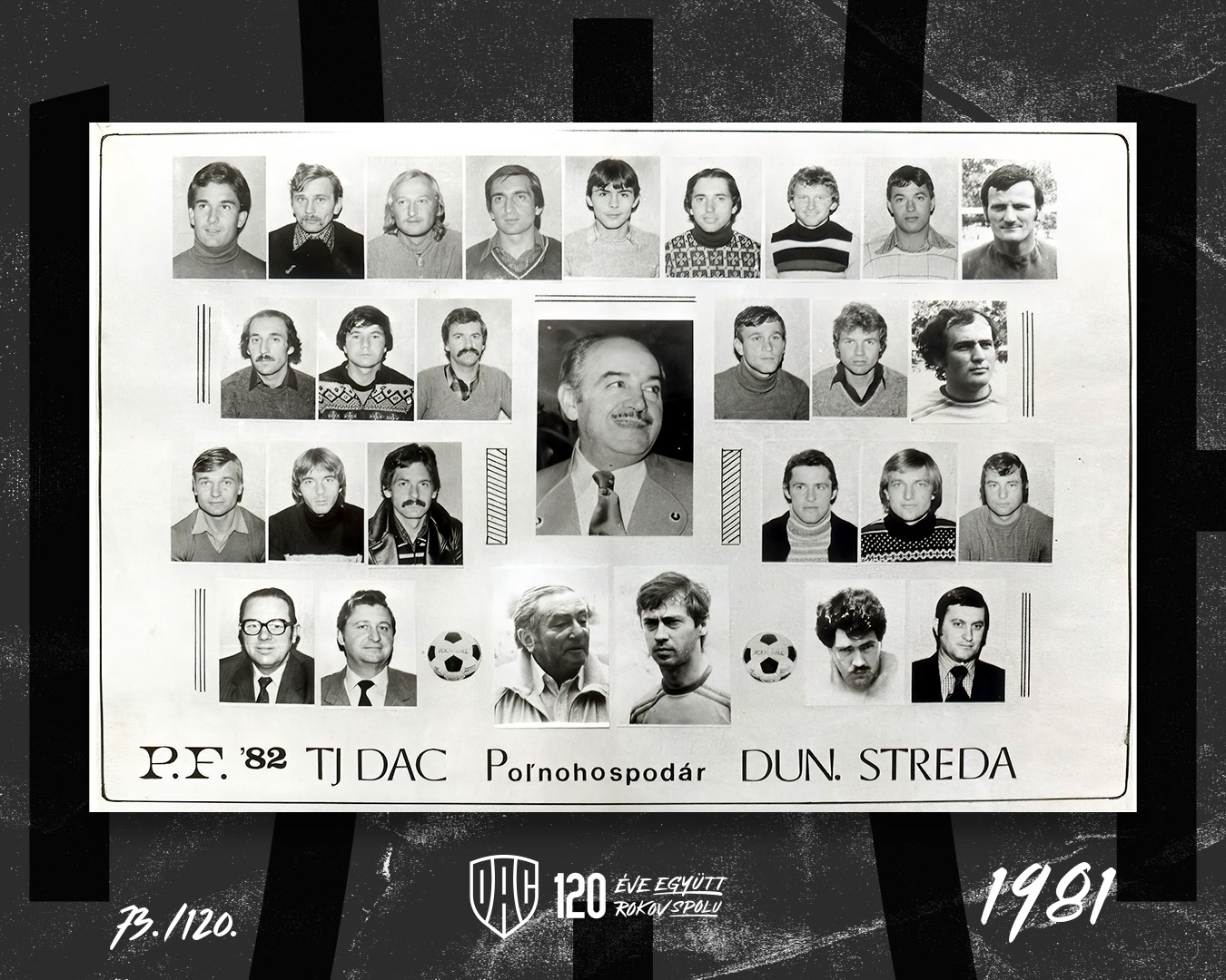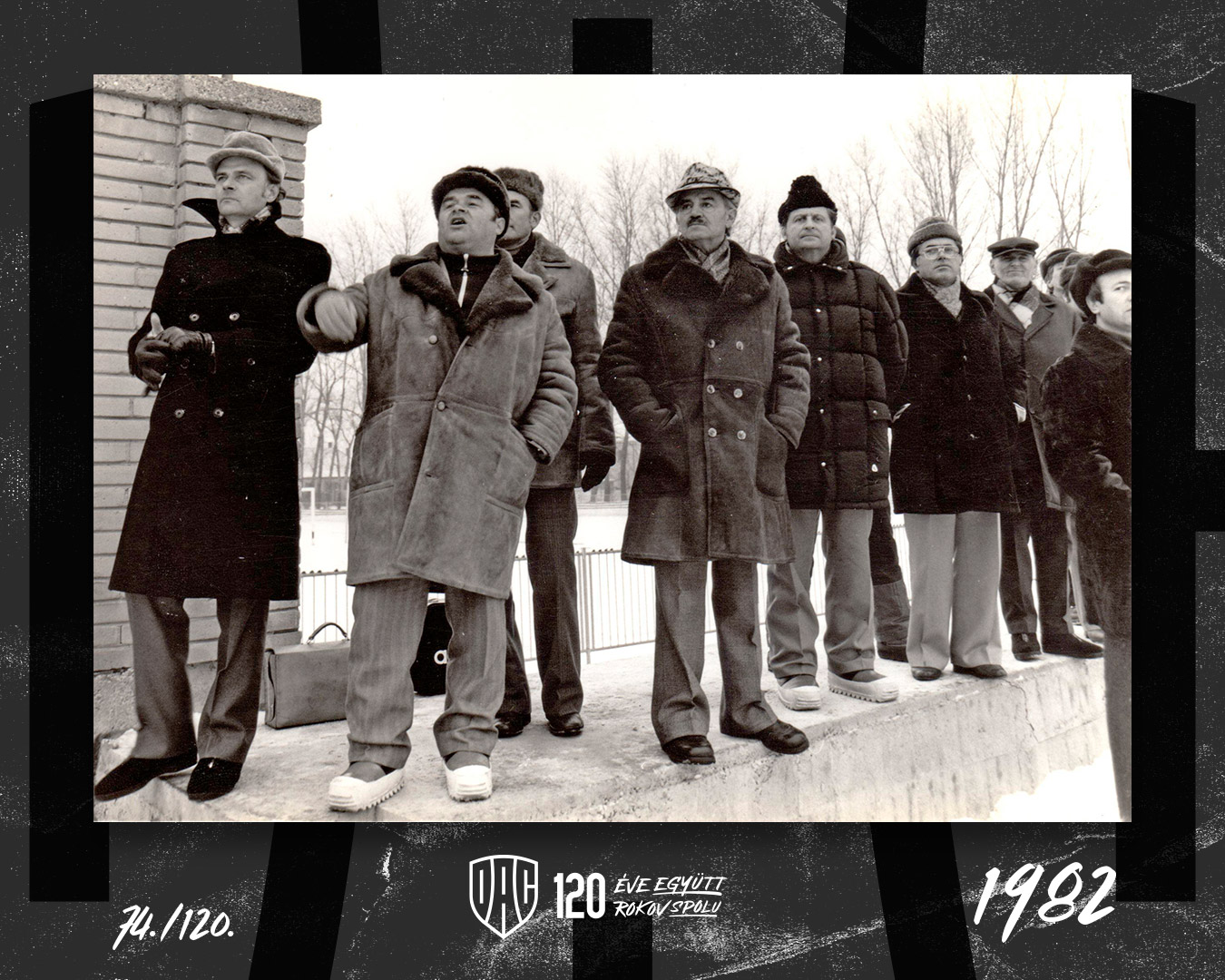 1982: tefan Jačiansky egyre romló egészségügyi állapota miatt 1982 elején edzőváltásra került sor. Januártól Anton Richtárik lett a DAC trénere, Gustáv kolek pedig a másodedző. Rajtuk kívül módszertani szakfelügyelőt is szerződtetett a klubvezetés, ezt a tisztet Ladislav Kačáni, egykori válogatott labdarúgó, az 1954-es vb résztvevője látta el, aki 1971-72 között a csehszlovák nemzeti tizenegy edzője volt. Felvétel a téli felkészülés egyik mérkőzéséről, balról Ladislav Kačáni, Anton Richtárik, Weisz Mihály (a DAC TE elnöke), dr. Stadtrucker Sándor (csapatorvos) és Nagy József (elnökségi tag).