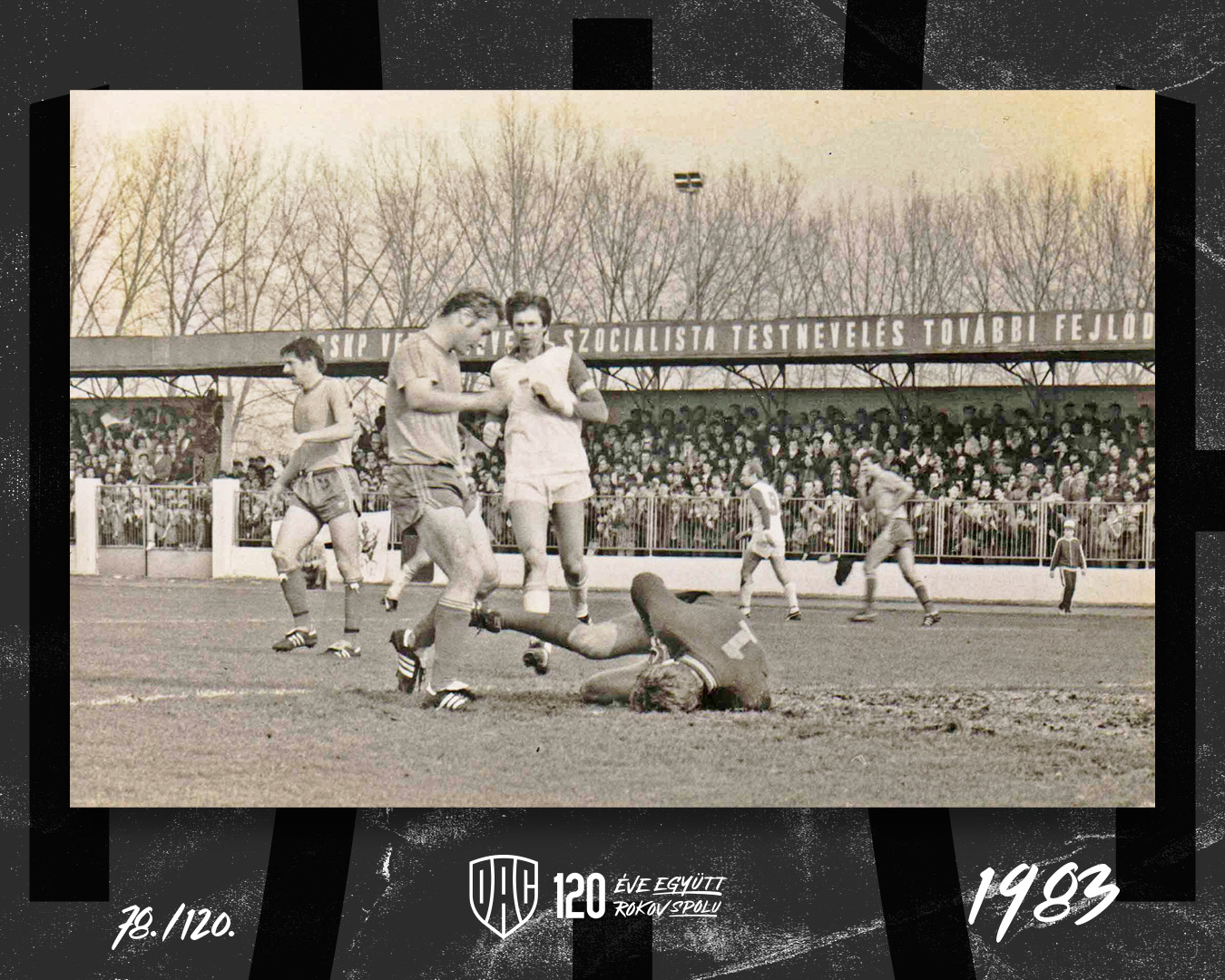1983: Az őszi elsőségből és egypontos előnyből a szezon végére 2. hely és négypontos hátrány lett a besztercebányai katonákkal szemben. Míg az idény első felében 10-4-1 volt a mérlegünk, tavasszal 6-5-4-es mutatót értünk el. Ehhez hozzájárult a 37 meccs után elszenvedett első hazai vereségünk, miután 1983 márciusában 6000 néző előtt 2:1-re kikaptunk a későbbi bajnoktól. Ez volt az első ligamérkőzés a stadionunkban, melyet élőben közvetített a televízió. A felvételen balról Tóth, Majoros, Kocian és a földön Magdolen, a vendégek kapusa.
