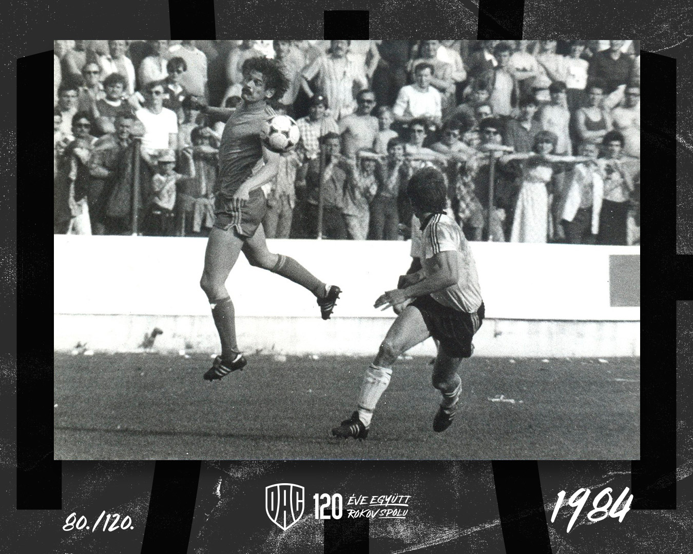 1984: Az 1983/84-es évadban a DAC középcsatára, Tóth László lett a Szlovák Nemzeti Liga gólkirálya! A csapat 61, ő egymaga 22 találatot szerzett. Gólvágónk balra a felvételen, amely a 28. fordulóban rendezett Petralka-DAC (3:1) feljutási rangadón készült. Ezt a találkozót 9856 néző látta.