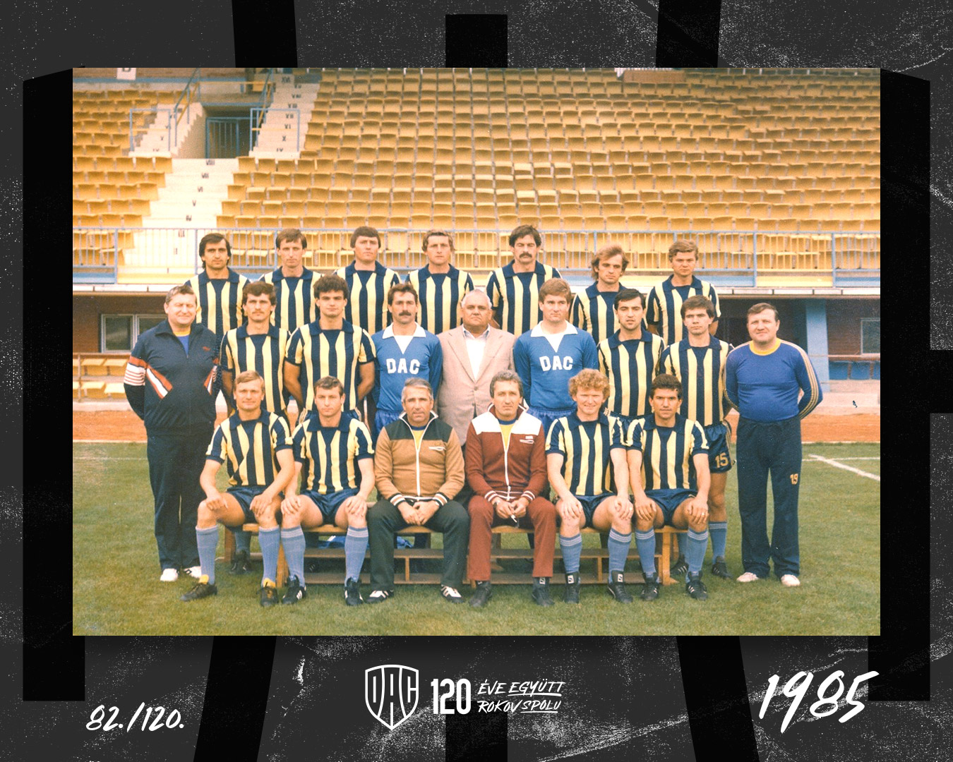 1985: A csapat, amely a csehszlovák labdarúgás térképére rakta Dunaszerdahelyt. A klubvezetés két második hely után sem adta fel, 1984 nyarán edzőnek leszerződtette Pecze Károlyt és tovább erősítette a keretet. Sorozatban harmadszor lett őszi bajnok a DAC, majd a tavaszi folytatásban sem hagyott semmit a véletlenre, bár a Nyitra és a Vágbeszterce is kemény ellenfélnek bizonyult. Már három fordulóval a bajnokság vége előtt biztos volt az elsőség! A nagy rivális Nyitra elleni hazai zárómérkőzésen tízezer néző ünnepelte a feljutást.