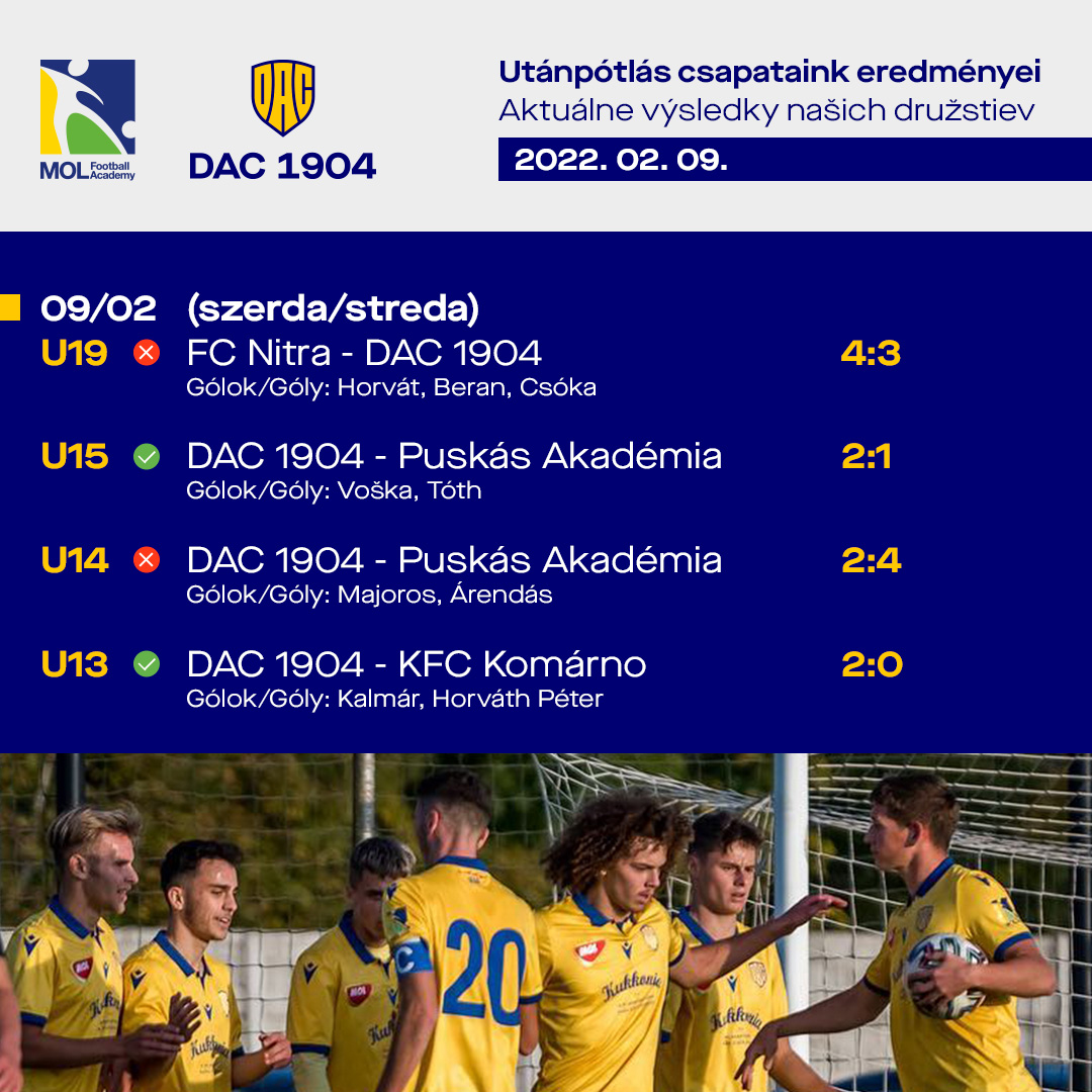 Az U19-es csapat idei első bajnokiját játszotta Nyitrán, sajnos nem jött össze a pontszerzés. A kisebb korosztályok felkészülési mérkőzeseket játszottak a MOL Akadémia pályáin.