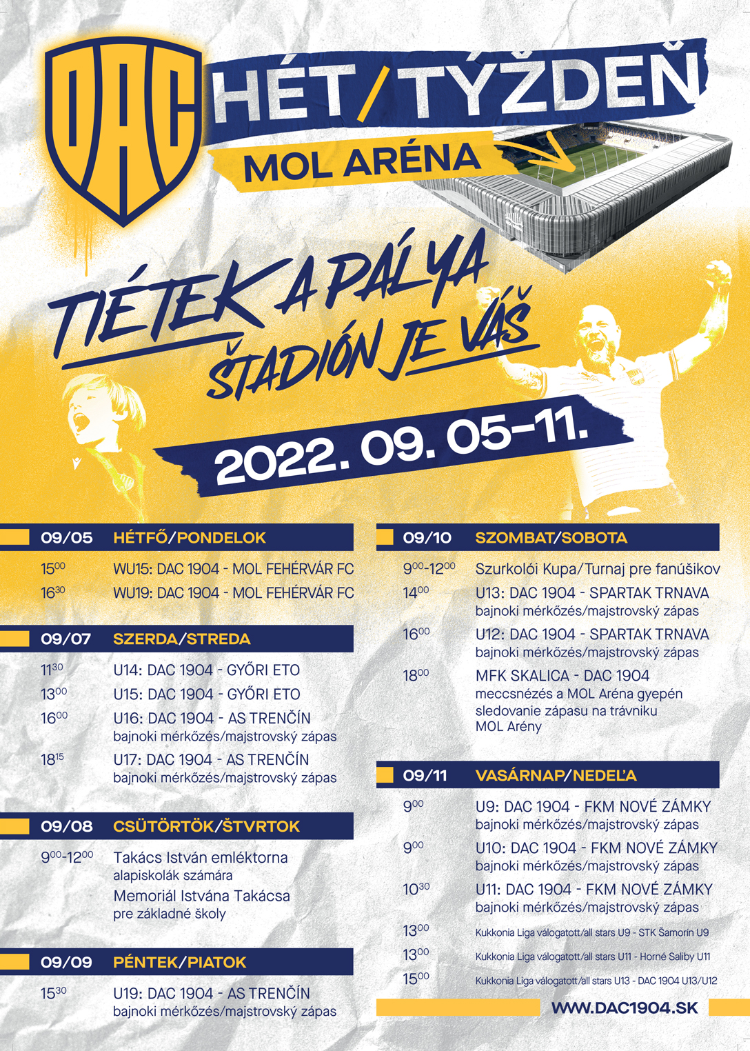 Szeptember 5-étől 11-ig rendhagyó hetet tartunk a MOL Arénában. Még mielőtt újra cserélnénk a fűkockákat, birtokunkba vesszük a pályát. A jelzett időben utánpótláscsapataink mérkőzéseit nem a MOL Akadémián, hanem stadionunkban, a MOL Arénában rendezzük meg. De ez még nem minden! Lesznek további gyermekprogramok, szurkolói minitorna, valamint szombat este a stadion kivetítőin közösen tekinthetjük meg a Szakolca-DAC 1904 bajnoki mérkőzést. Iskolások, felnőttek és lélekben fiatalok, most tiétek a pálya!