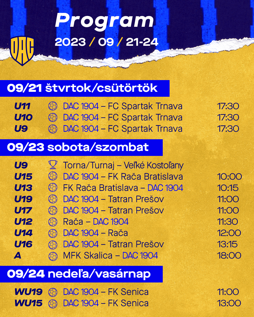 Vásár és foci. Csütörtöktől vasárnapig tart a sárga-kékek programja a 41. Csallóközi Vásár hetében, bajnoki mérkőzésekkel és tornával. Íme, a hét futballmenüje – szurkolóinkat sok szeretettel várjuk a lelátókra!