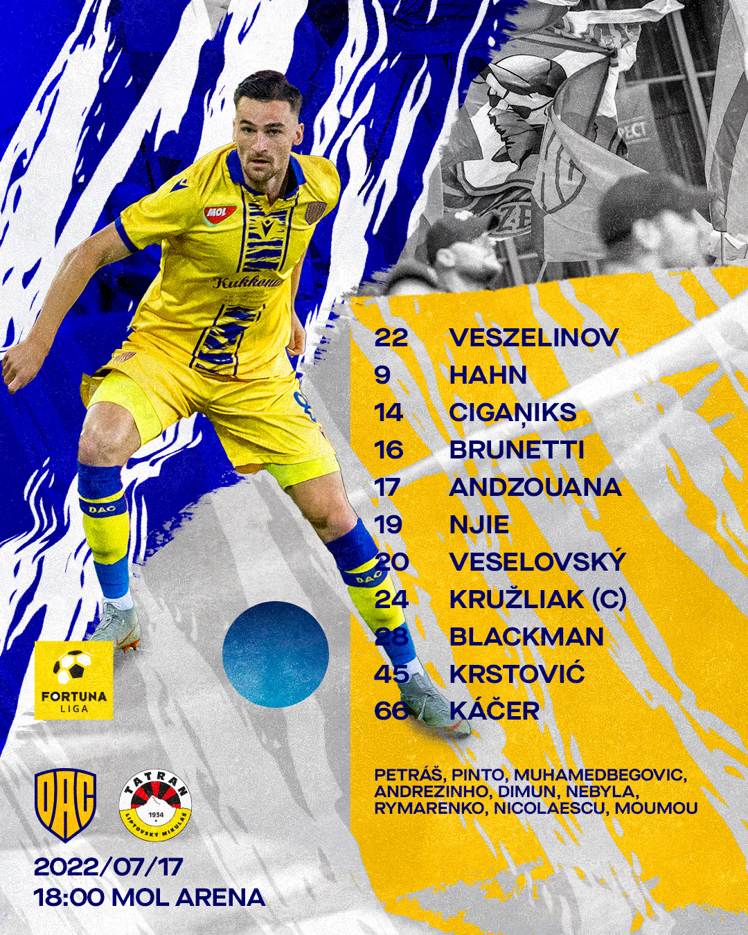 Veszelinov – Blackman, Kružliak, Brunetti, Ciganiks – Káčer, Njie, Veselovský – Andzouana, Krstović, Hahn.