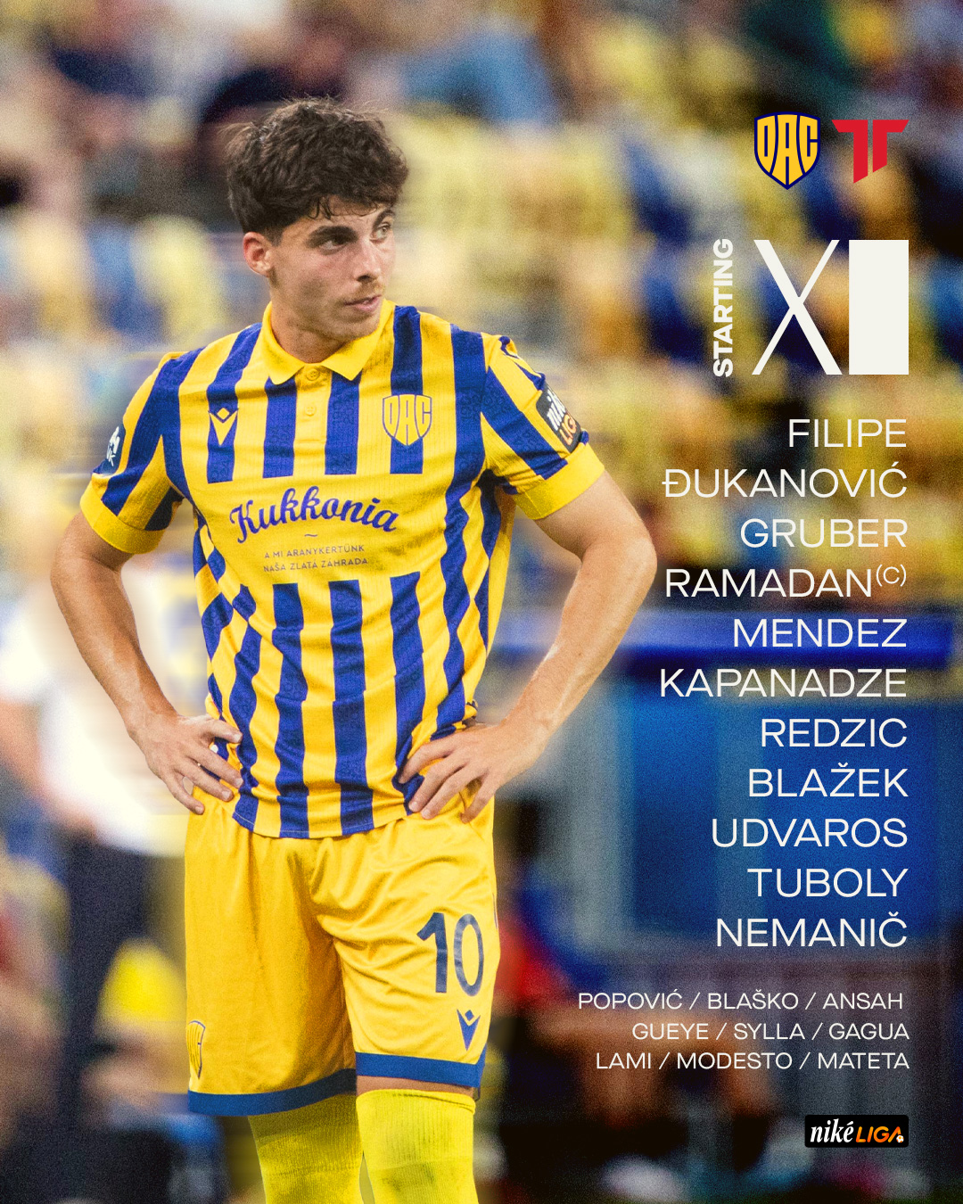 Filipe – Kapanadze, Blažek, Nemanič, Mendez – Gruber, Tuboly, Udvaros – Redzic, Djukanović, Ramadan