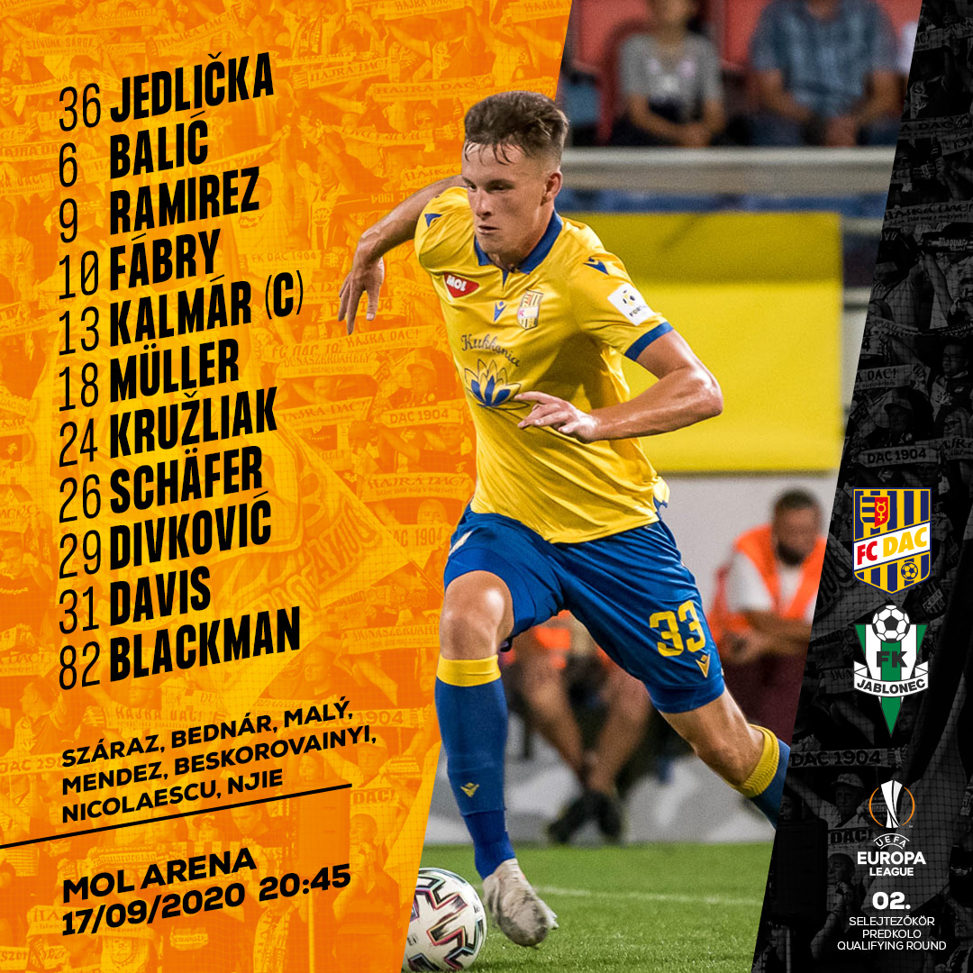 A gyomorproblémákkal küzdő Friede nélkül, de az ex-jabloneci Fábryval a kezdőben áll ki a DAC a mai Európa-liga selejtezőn. Mindent bele!