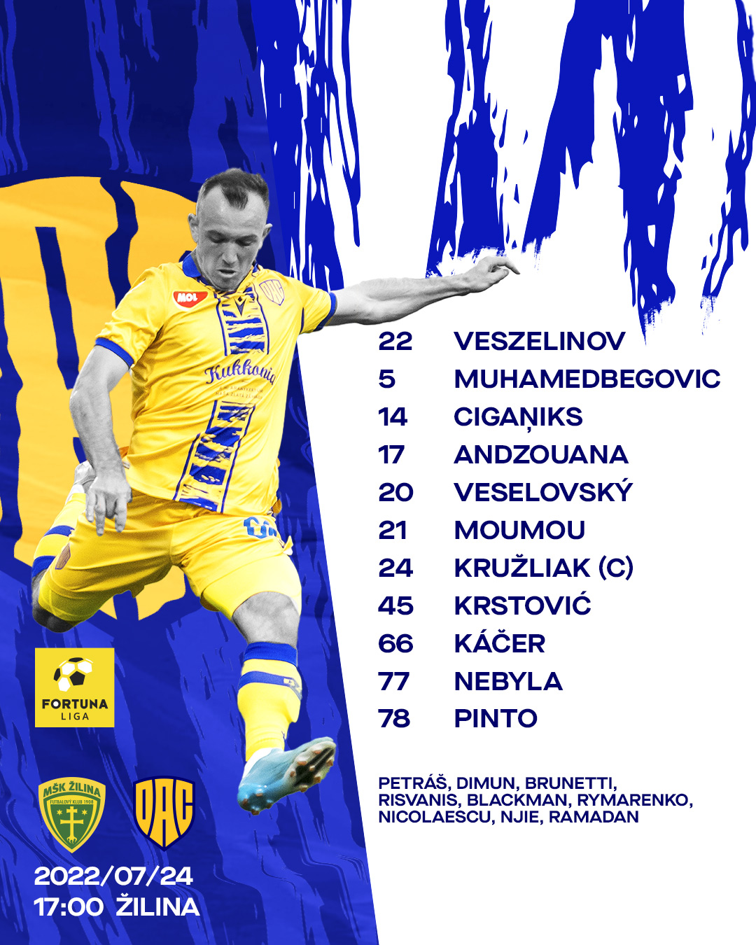 Veszelinov – Pinto, Kružliak, Muhamedbegovic, Ciganiks – Veselovský, Nebyla, Káčer – Andzouana, Krstović, Moumou.