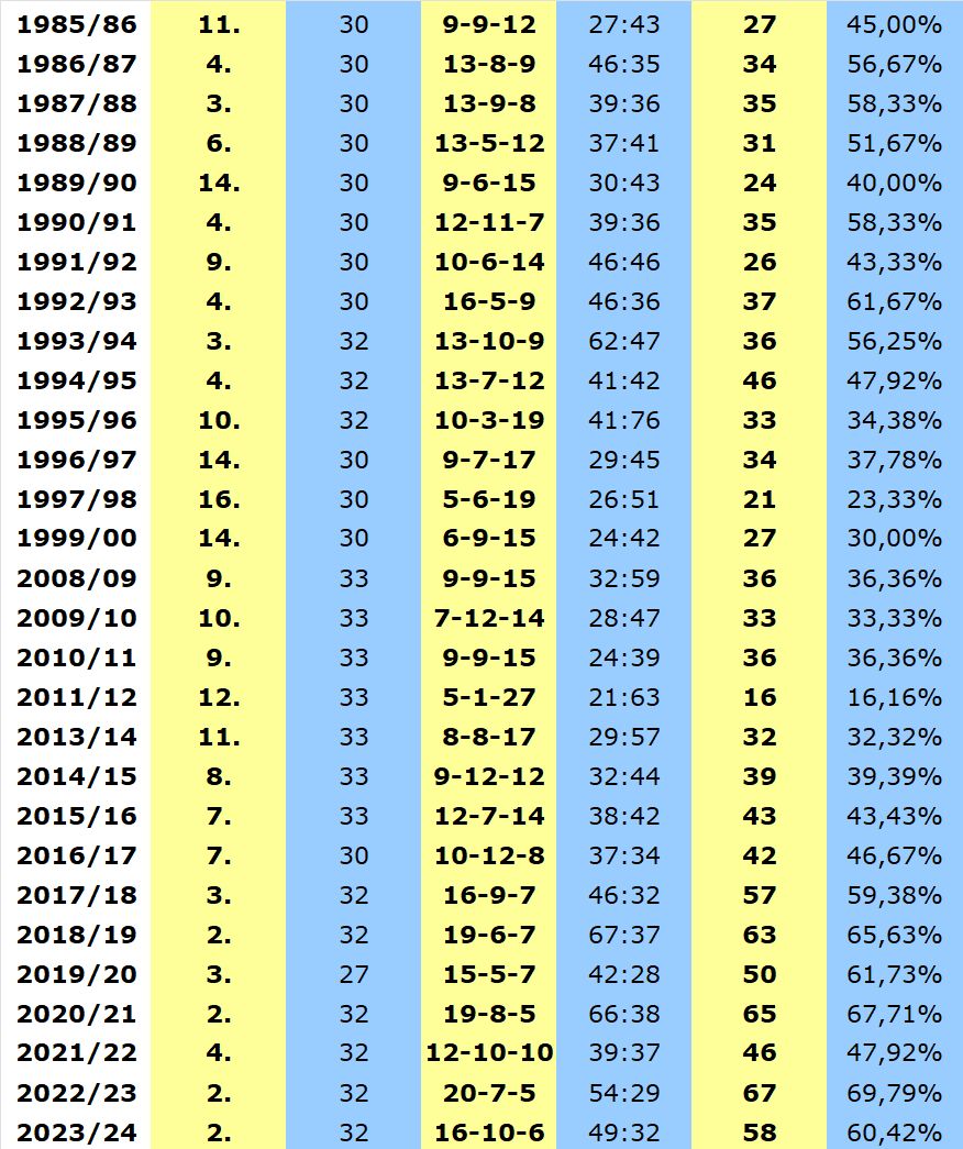 Jelmagyarázat: A szezon után következik a táblázaton elért helyezés, mérkőzések száma, mérleg (győzelem, döntetlen, vereség), gólarány, pontszám és a megszerzett pontok százaléka.