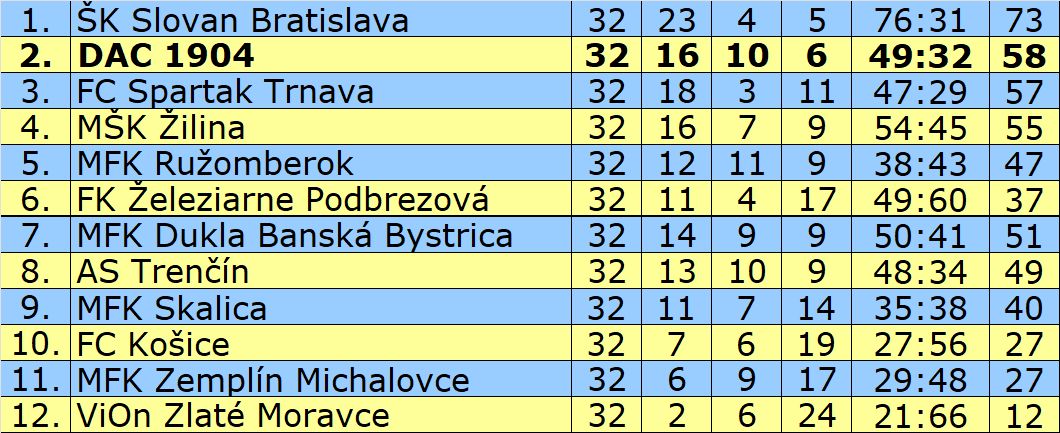 Huszonkilencedik idényét zárta a DAC az 1. ligában, az összesített mérleg a következő: 908 mérkőzés, 339-226-343, a gólarány 1139:1240