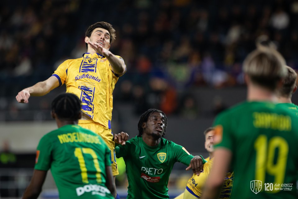Kacharaba rúgja az égbe a labdát a lehető legjobb pillanatban, külünben egyedül ment volna vele kapura a zsolnai.
