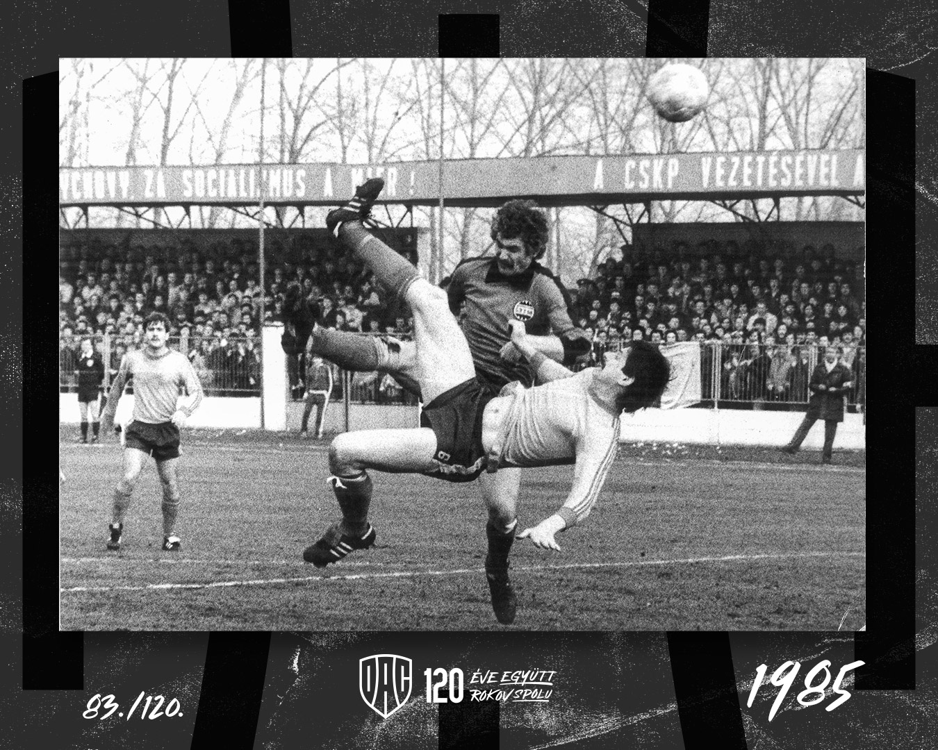 1985: Po roku získal korunu kráľa strelcov Slovenskej národnej ligy opäť Ladislav Tóth, rovnako s 22 gólmi. Mužstvo v 30 kolách sezóny 1984/85 zaznamenalo spolu 60 presných zásahov. Jeden z ikonických momentov na našom štadióne: Laci Tóth strieľa nožničkami otvárací gól zápasu DAC-Púchov (2:1) na jar 1985.