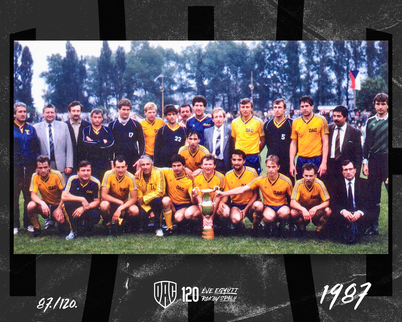 1987: Mužstvo DAC-u v nedeľu 21.6.1987 na štadióne v Kopřivnici, krátko po víťazstve nad Spartou Praha vo finále Československého pohára. K zisku najcennejšej trofeje v klubovej histórii pridali zverenci trénera Karola Peczeho v sezóne 1986/87 aj 4. miesto vo federálnej lige, ako najúspešnejší tím zo Slovenska. Návštevnosť na domácich zápasoch bola 8265 divákov (viac sme mali len v ročníku 2018/19 - 8445).