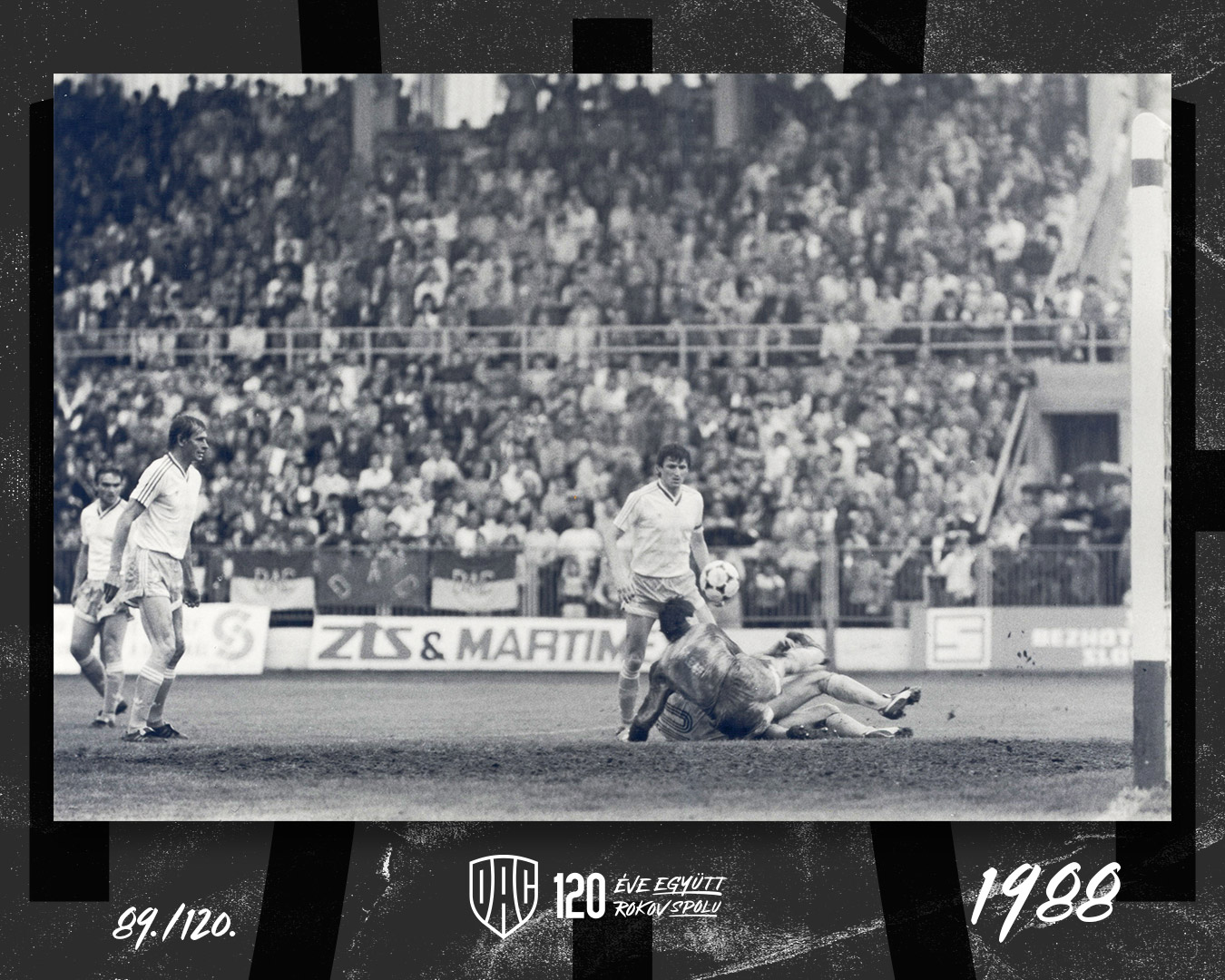 1988: V sezóne 1987/88 dosiahol DAC historicky prvé medailové umiestnenie v najvyššej súťaži - mužstvo trénera Karola Peczeho predstihli len dva pražské celky, Sparta a Dukla. Na jar už stála aj východná tribúna (v pozadí), domáce zápasy videlo v priemere 7447 divákov. Na obrázku najlepší strelec mužstva, 9-gólový Tibor Mičinec (s číslom 10 na zemi) bojuje o loptu s nitrianskym brankárom Ladislavom Molnárom.