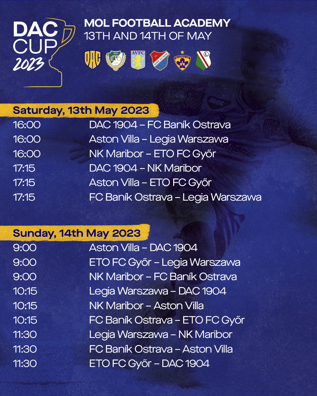 Počas nadchádzajúceho víkendu nás v MOL Akadémii čaká ďalší napínavý futbalový turnaj, na ktorý zavítajú zahraničné tímy vekovej kategórie U13 z piatich krajín. Na podujatí, ktoré sa uskutoční v sobotu 13. mája a v nedeľu 14. mája, budú popri DAC 1904 účinkovať český FC Baník Ostrava, anglický Aston Villa, poľská Legia Varšava, slovinský NK Maribor a maďarský ETO FC Győr.