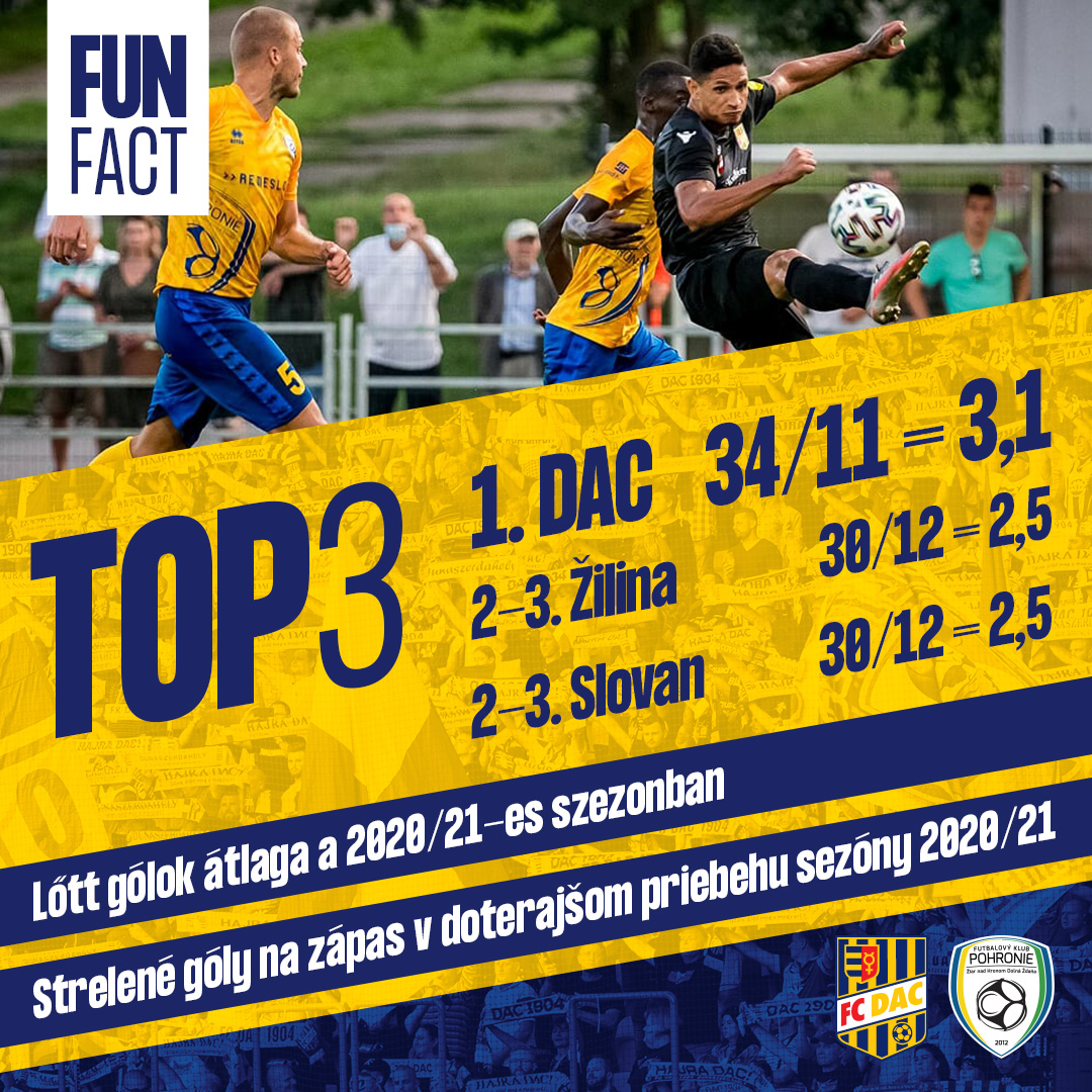 Pred treťou a poslednou reprezentačnou prestávkou jesene privítame v MOL Aréne nateraz posledný tím ligového poradia FK Pohronie. DAC do zajtrajšieho zápasu vstúpi nielen ako líder celkového poradia, ale aj ako mužstvo s najvyšším počtom a najlepším priemerom nastrieľaných gólov. V 11 kolách sme sa strelecky presadili 34-krát, čo znamená 3,1 gólu na zápas. Aj v tomto poradí sú za nami Slovan a Žilina, ktorí dosiahli zhodne po 30 zásahov v 12 zápasoch, t.j. ich priemer je 2,5.