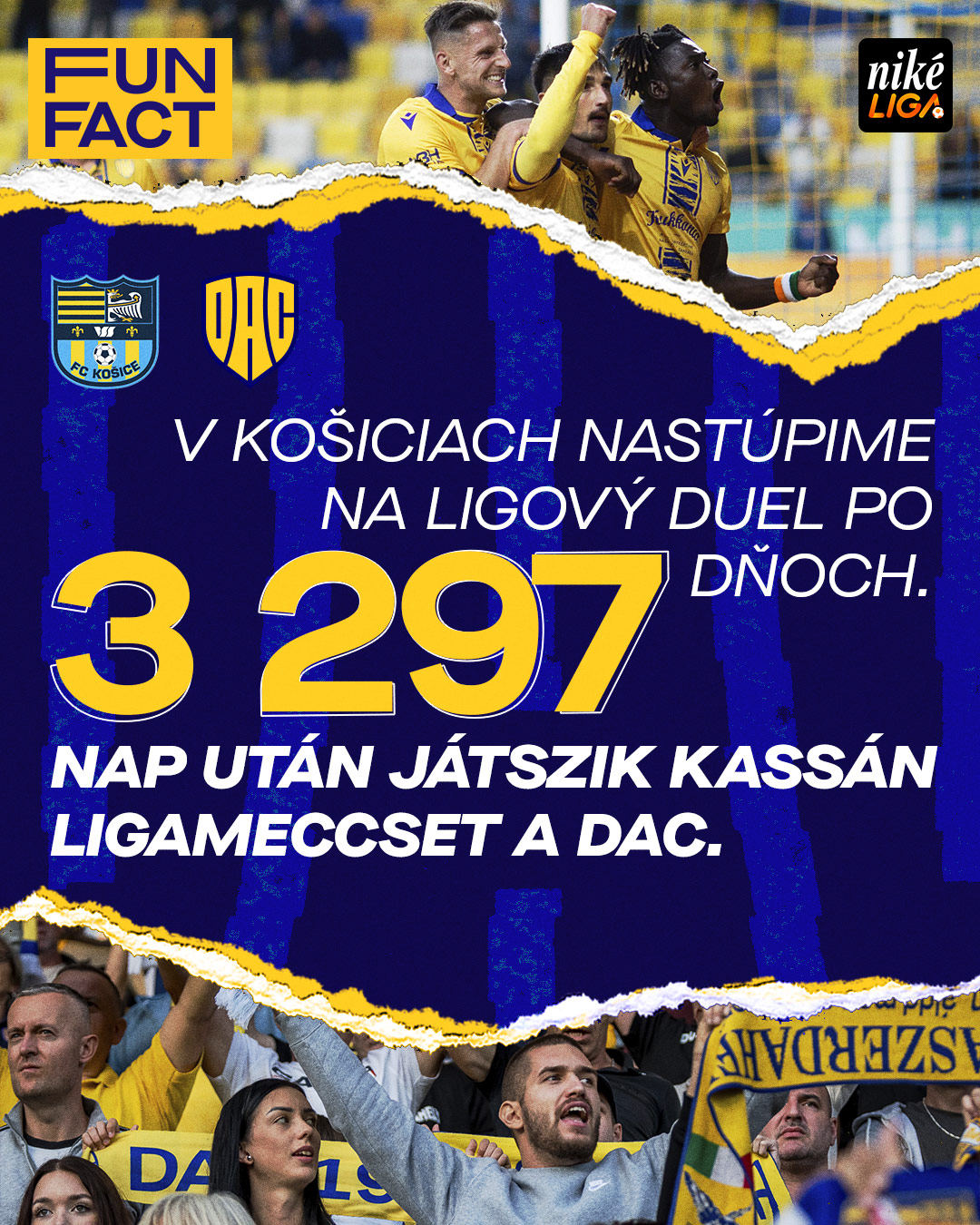 „Po súboji v Košiciach hráme v utorok pohár, takže všetci futbalisti sú dôležití. Risvanisov štart je otázny pre chorobu, čo nás mrzí a uvidíme, či sa podarí dať Ramadana do takého stavu, aby bol pripravený aspoň na časť zápasu. Ostatní, okrem dlhodobo zranených, sú v poriadku, aj Redzic a Záhradník už trénovali s mužstvom a sú k dispozícii. Preto očakávam, že podáme plnohodnotný tímový výkon a verím, že zápas zvládneme k našej spokojnosti,“ dodal náš kouč pred prvým vystúpením DAC-u v novej Košickej Futbalovej Aréne, ktorá má momentálne kapacitu 5836 miest, po ukončení však tento počet porastie na 12 658. Za jej architektúrou a tiež výstavbou stoja rovnaké spoločnosti, ako tomu bolo v prípade našej MOL Arény. V Košiciach odohráme ligový duel po dlhých 9 rokoch, presne 3297 dňoch.