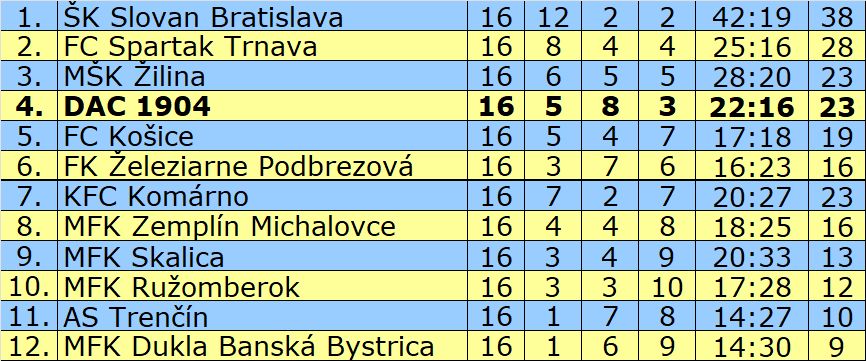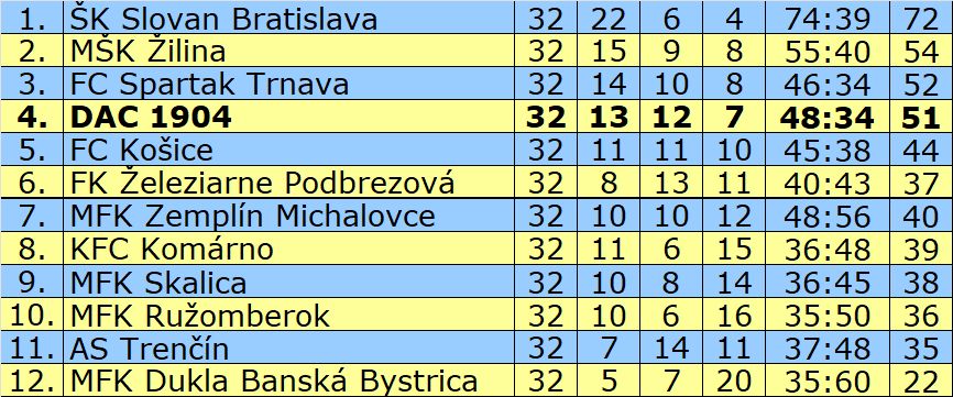 Štvrté miesto celkovo, druhé v tabuľke jari, ôsma účasť v pohárovej Európe za sebou. Účinkovanie DAC-u v uplynulej sezóne si zhodnotíme aj cez čísla a štatistiky - na úvod prinášame tabuľky ligové aj historické.
