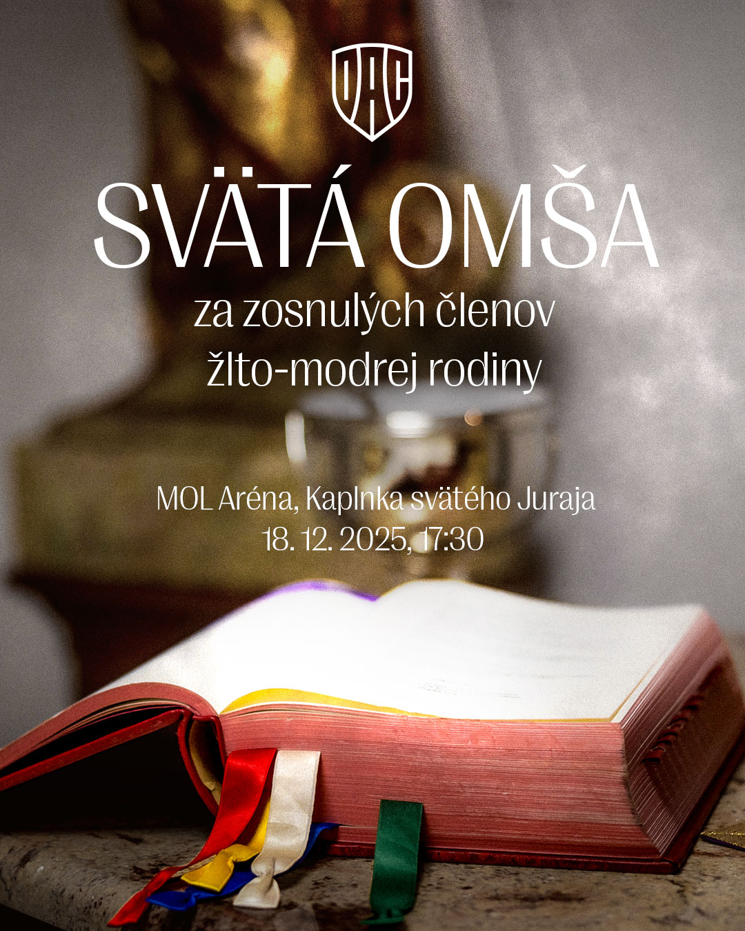 Svätá omša za zosnulých členov žlto-modrej rodiny, ktorí nás navždy opustili v roku 2025. Udalosť je otvorená pre verejnosť a uskutoční sa v kaplnke Svätého Juraja MOL Arény.