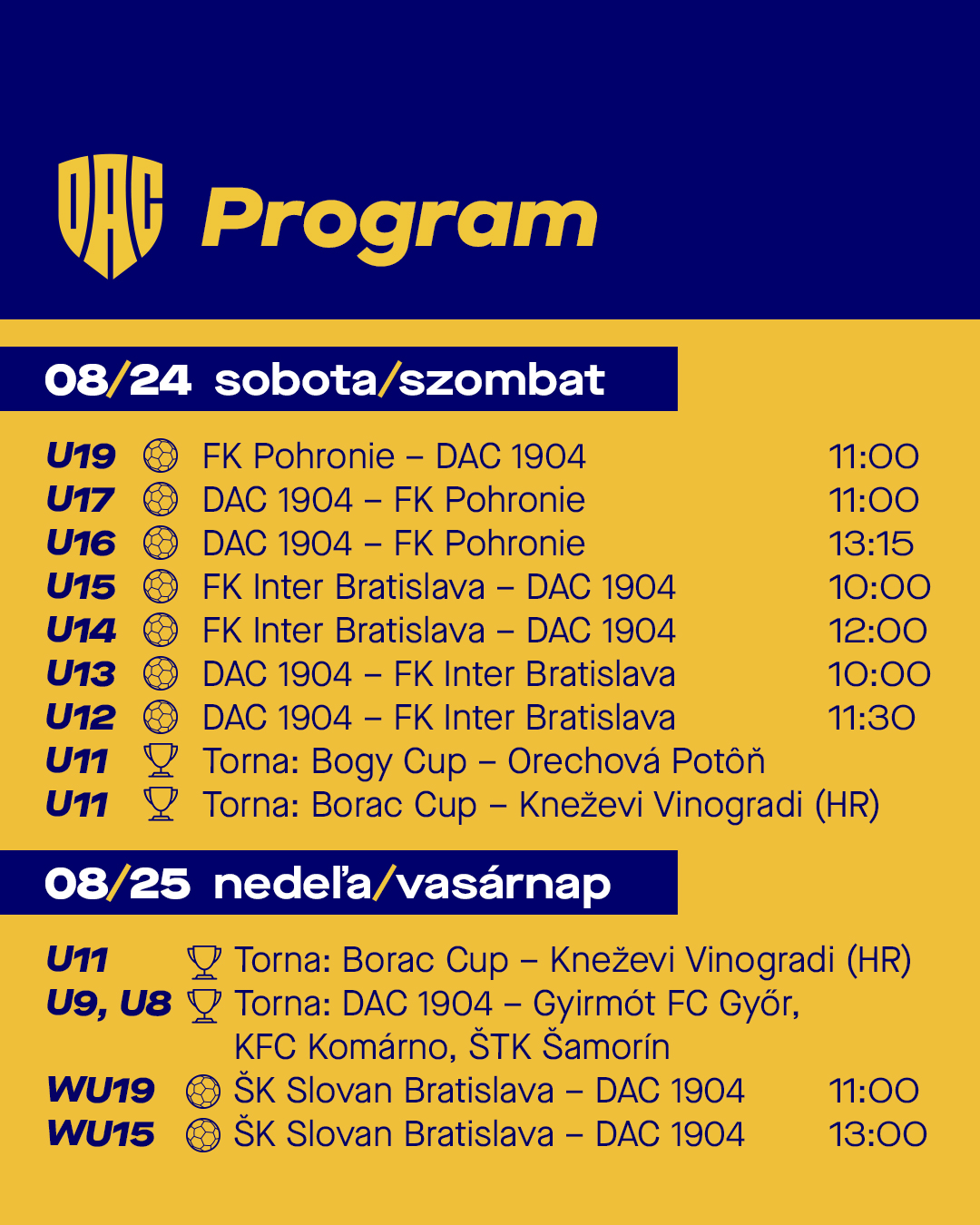 V sobotu 24. augusta sa niekoľko našich družstiev predstaví na domácej pôde proti FK Pohronie a Interu Bratislava. Tímy U11, sa zúčastnia dvoch rôznych turnajov, Bogy Cupu v Orechovej Potôni a Borac Cupu v Chorvátsku. Tímy U9 a U8 sa predstavia na domácom turnaji. Dievčatá, WU19 a WU15 sa stretnú s bratislavským Slovanom Bratislava. Tento víkend čakajú naše akademické tímy opäť výzvy a napínavé zápasy.