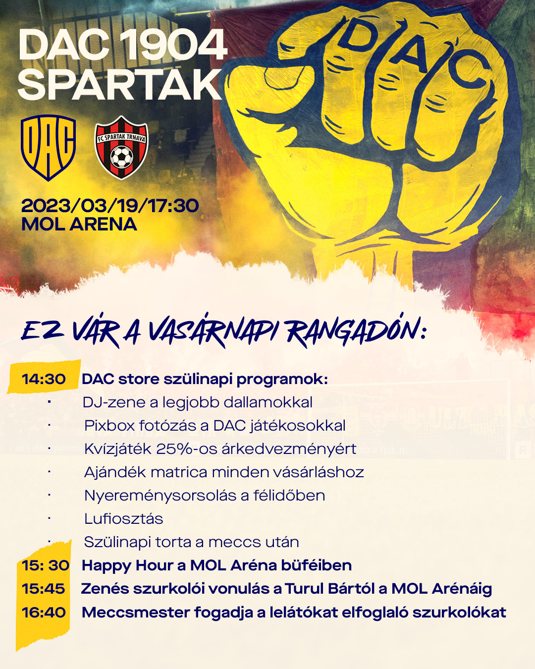 A helyfoglalás sem zajlik majd néma csendben, hiszen a játéktér széléről Bernáth Tamás meccsmester, a Komáromi Jókai Színház színésze fogja szórakoztatni a nézőket. A mérkőzés előtt és után is érdemes betérni az ötödik születésnapját ünneplő DAC store-ba, ahol színes program és nyereményjáték vár a vásárlókra, melynek győzteseit a mérkőzés félidejében sorsoljuk ki. A rangadó után pedig játékosainkkal és Világi Oszkár klubtulajdonossal együtt felvágjuk a szülinapi tortát a DAC store-ban.