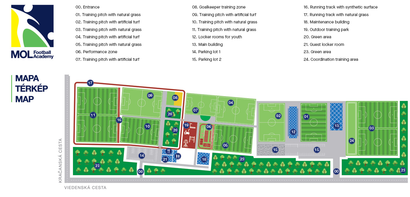 MOL Football Academy is the most modern training center in Slovakia, built between Vienna and Karcsai street, in the southwestern part of Dunajská Streda. This training and sports center provides space for 14 teams, 30 coaches and technical staff. In addition, it is also available as training center for the club´s A-team and youth teams. The academy has 10 fields and 3 special fields with a total area of 10 hectares, with an area of 8,000 square meters, and roads and pavements of 26,000 square meters. (googlemaps)