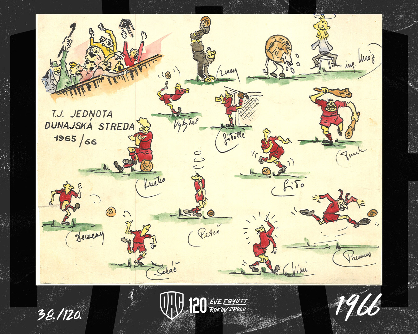 1966: A dunaszerdahelyi Jednota csapata 1966. március 6-án, a Gúta elleni győztes bajnoki mérkőzésen (4:3). Felső sor, balról: Mráz játékosedző, Gödölle, Vími, Petes, Vykydal, Csóka; alsó sor: Turek, Krecsko, Dömény, Sidó, Prémusz.
