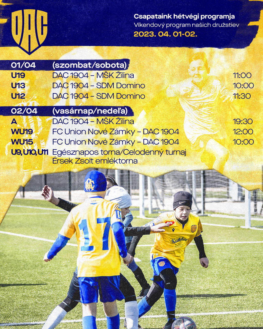 Íme, a sárga-kékek futballmenüje április első hétvégéjén – szurkolóinkat sok szeretettel várjuk a lelátókra!