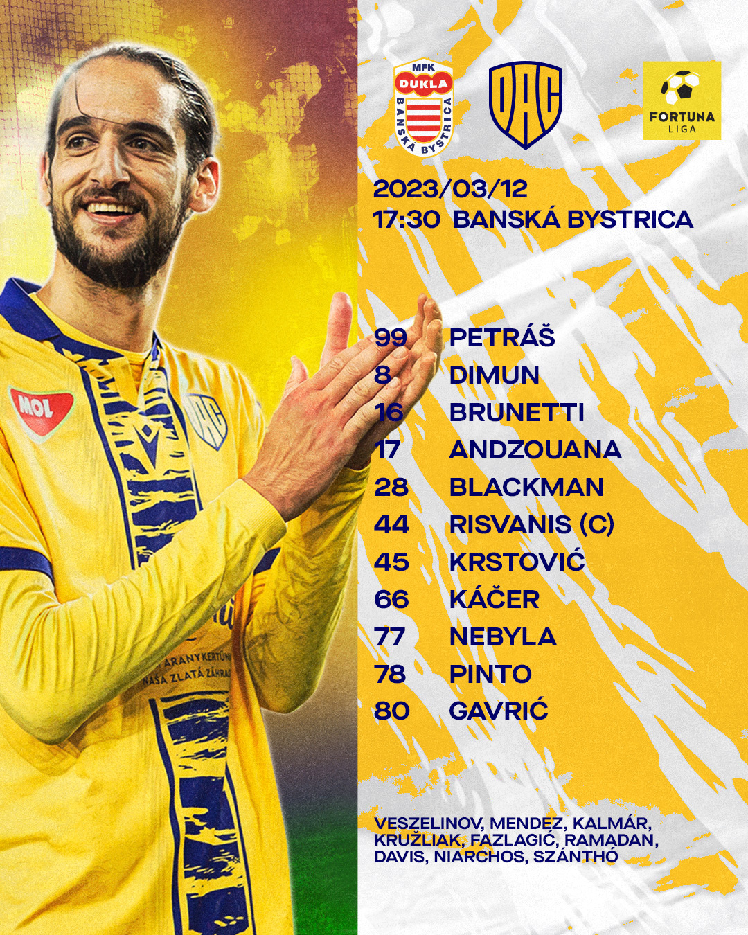 Petráš – Pinto, Risvanis, Brunetti, Andzouana – Káčer, Dimun, Nebyla – Blackman, Krstović, Gavrić