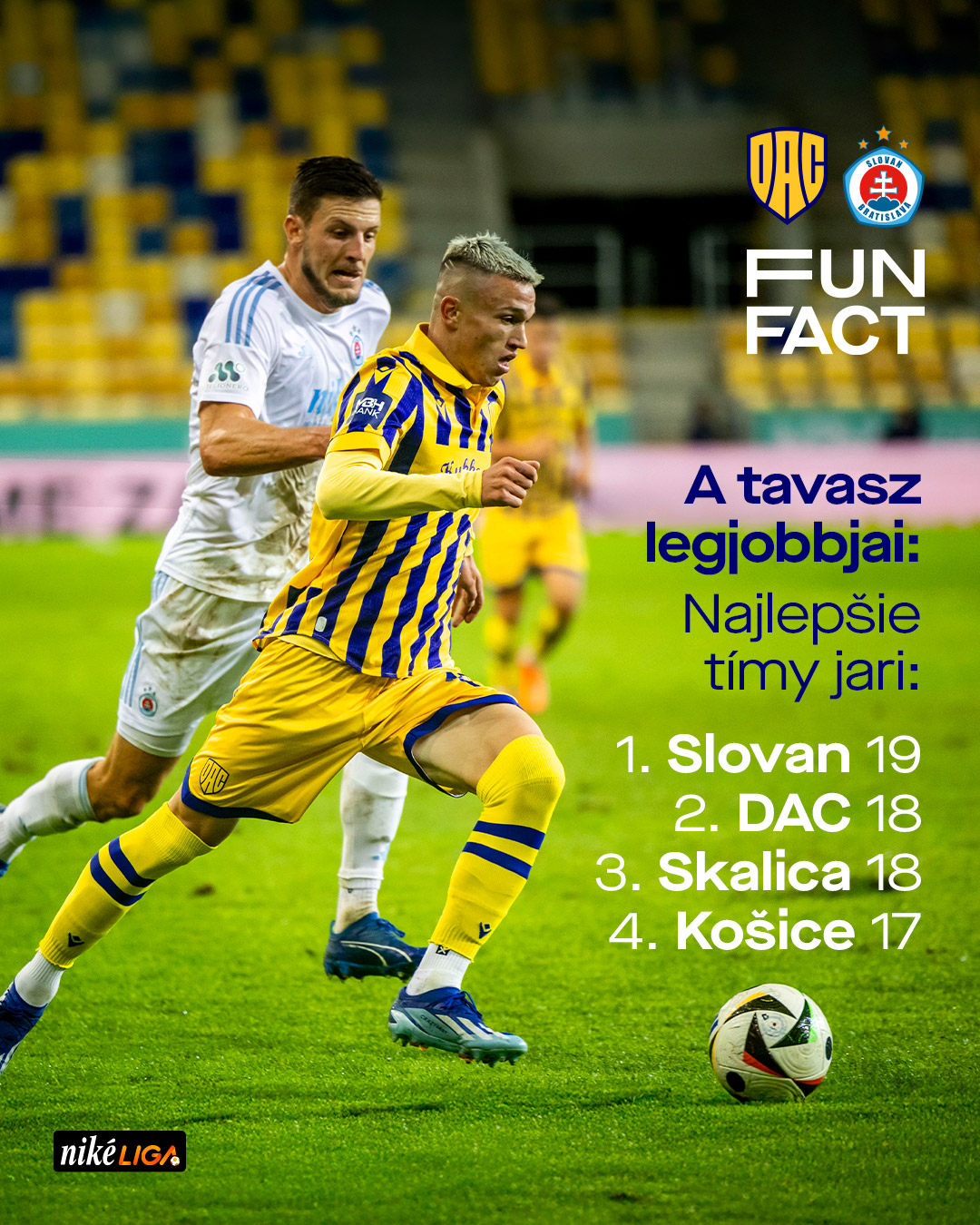 Ráadásul holnap este a tavasz két legsikeresebb csapata találkozik a MOL Arénában. A Slovan a tíz idei fordulóban 19 pontot szerzett, a DAC – a 2025-ös év egyetlen veretlen együtteseként – 18-at gyűjtött. A rájátszás táblázatán is ugyanez a sorrend: a 6. forduló után a 14 pontos Slovan vezet, az égszínkékeket a 10 pontos DAC követi.