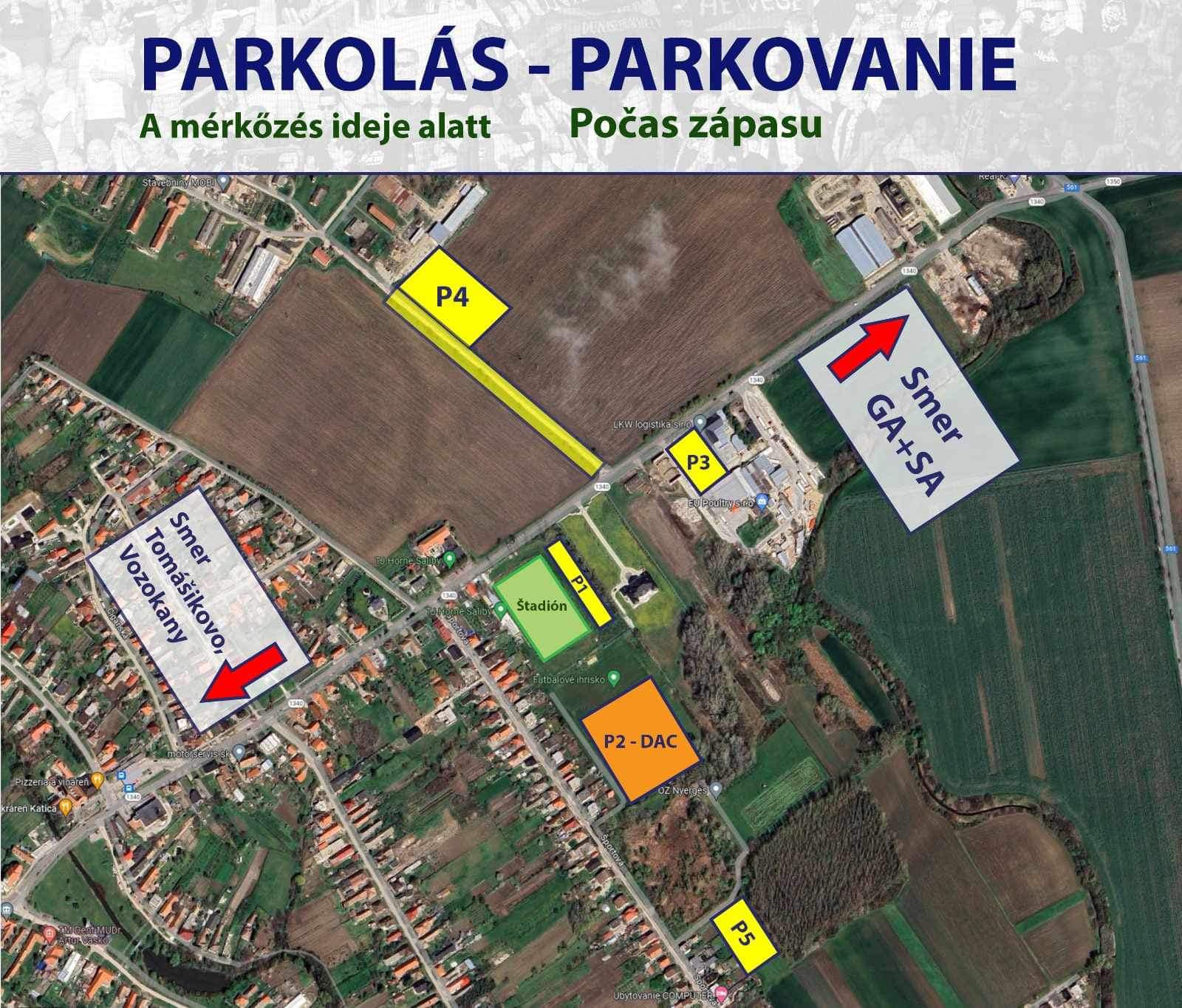 Parkovanie pre našich fanúšikov bude vyhradené na tréningovej ploche v areáli štadióna (P2 na mapke nižšie). Vjazd je zo Športovej ulice. Prosíme vás, aby ste sa riadili pokynmi usporiadateľov. Priamo v areáli štadióna bude pre fanúšikov otvorených viacero bufetov.