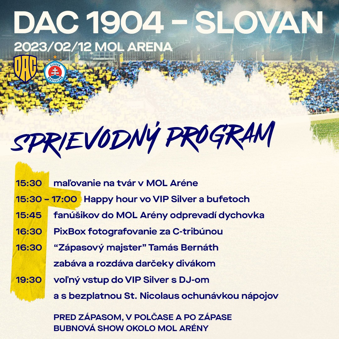 Nedeľné derby DAC-Slovan je jedným z najočakávanejších zápasov sezóny, v ktorom tentoraz nebude hrať hlavnú úlohu iba lopta, ale aj fanúšikovské zážitky. Preto sa oplatí prísť do MOL Arény v značnom predstihu pred úvodným hvizdom, kde sa na zápas naladíme bohatým sprievodným programom.