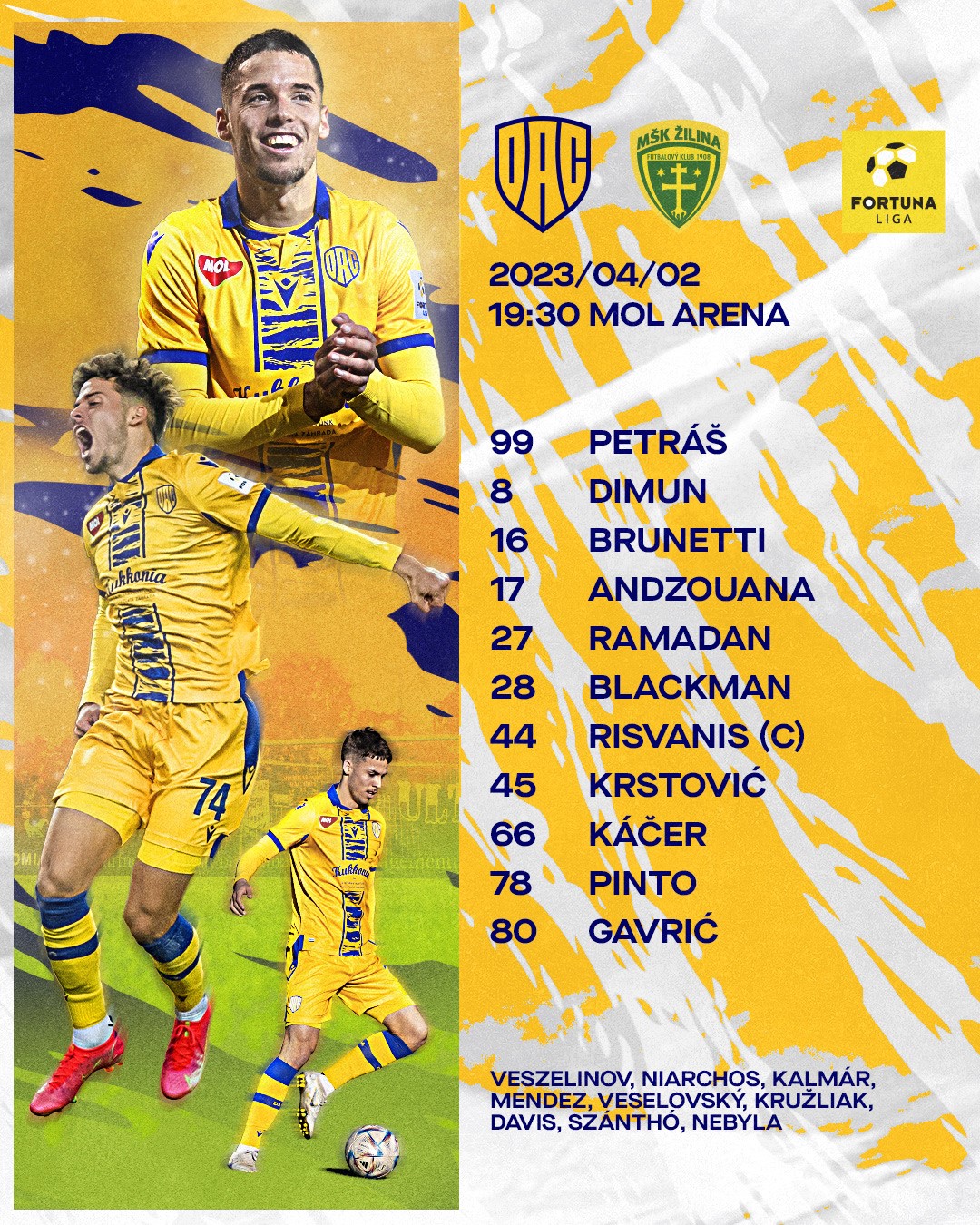Petráš - Pinto, Risvanis, Brunetti, Andzouana - Káčer, Dimun, Ramadan - Blackman, Krstović, Gavrić