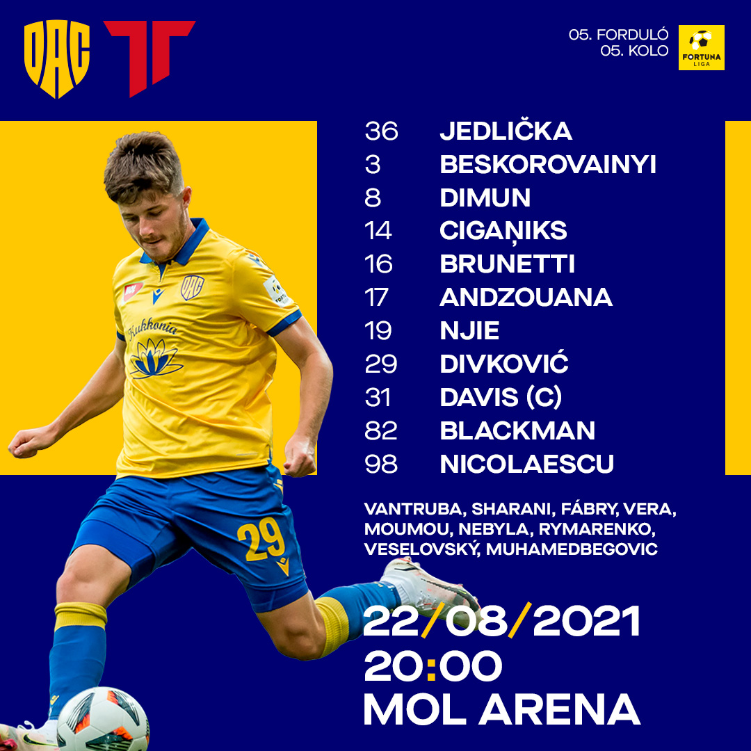 Jedlička - Blackman, Brunetti, Beskorovainyi, Davis - Njie, Andzouana, Dimun - Divković, Nicolaescu, Ciganiks.