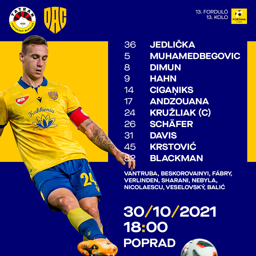Chýbajú: Kalmár, Moumou, Brunetti, Njie, Szendrei (zranenie), Lamkel Zé (choroba)