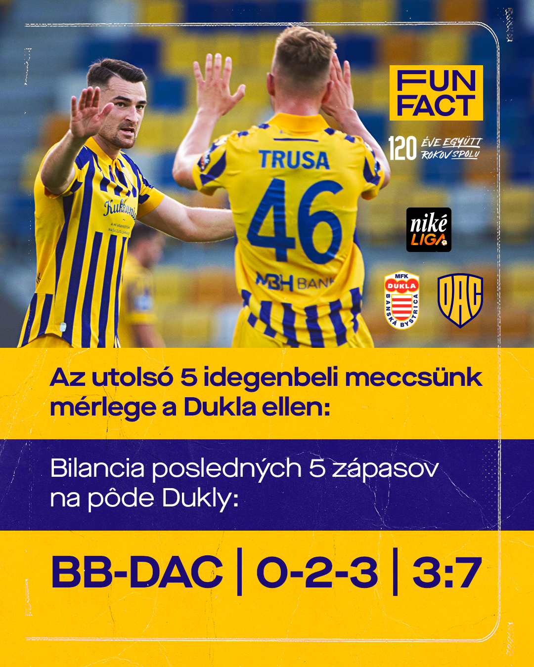 Históriu vzájomných duelov píšeme od jesene 1985, celkovo sme na seba narazili už 52-krát. V sezóne 2022/23 DAC vyhral všetky štyri zápasy, a to po dlhom čase naklonilo bilanciu na našu stranu. Vlani ju však Dukla mierne vylepšila, nakoľko vyhrala v MOL Aréne a v spomínanom decembrovom dueli na jej pôde gól nepadol.