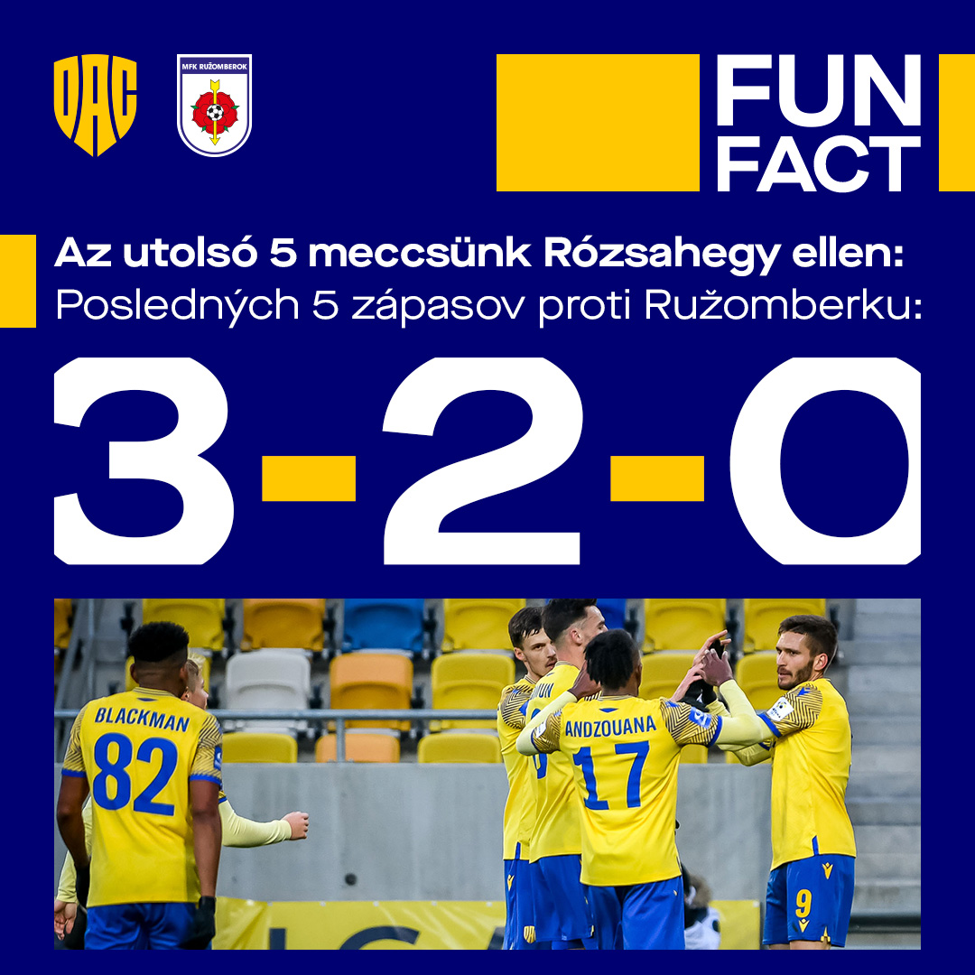 Ružomberok, majiteľ majstrovskej hviezdičky z roku 2006, pôsobí v našej najvyššej súťaži nepretržite od sezóny 1997/98. Bilancia doterajších 42 vzájomných zápasov v prvej lige je stále naklonená súperovi, hoci posledných 5 duelov dopadlo lepšie pre nás: popri troch víťazstvách DAC-u sa zrodili 2 remízy (pritom až štyrikrát sme hrali vonku). Posledná návšteva Ruže v MOL Aréne priniesla náš pamätný obrat v početnom oslabení s tromi gólmi v priebehu 6 minút.