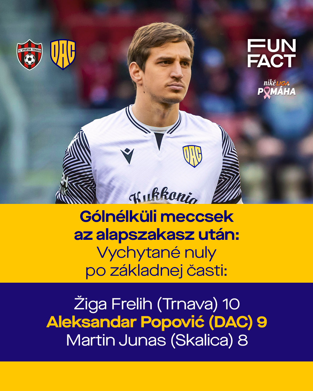 Slovinský brankár Spartaka Žiga Frelih si v doterajšom priebehu súťaže pripísal 10 vychytaných núl, čo je najviac v lige. Hneď za ním je s 9 zápasmi náš Aleksandar Popović.