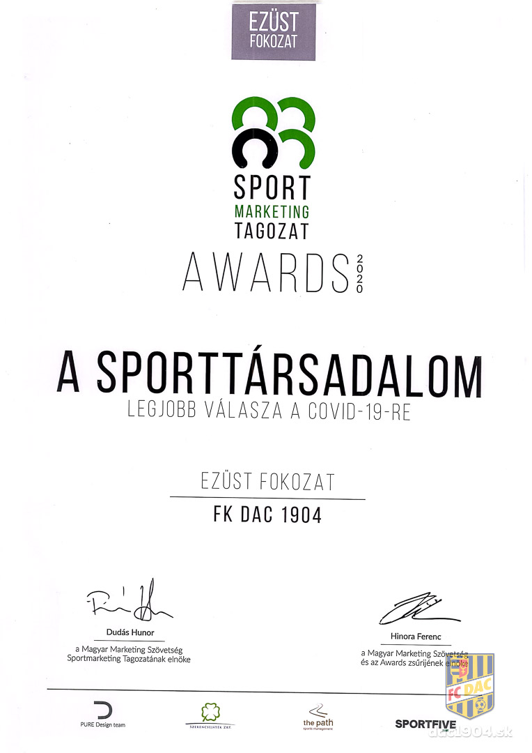 Futbalový klub DAC získal striebornú medailu v rámci udeľovania cien Sportmarketing díj v kategórii „Najlepšia spoločenská odpoveď na Covid-19“. Túto prestížnu cenu nám udelili za našu kampaň #veledNélküled. Tá sa uskutočnila cez dva víkendy, 28. marca a 4. apríla 2020, teda v období, keď sme boli všetci uzatvorení vo vlastných domovoch.