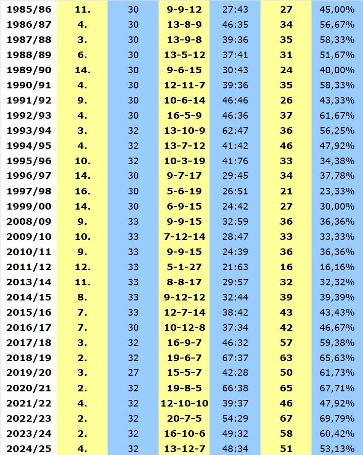 Legenda: za ročníkom nasleduje umiestnenie v konečnej tabuľke, počet kôl, bilancia (víťazstvá-remízy-prehry), skóre, získané body a percentuálny bodový zisk